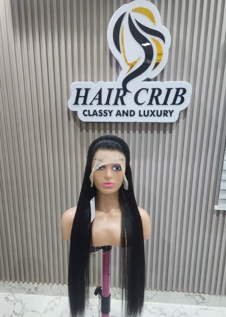 The wig is placed on a mannequin head, which is fixed to a black stand. The wig is in a display setting with shelves and hooks.